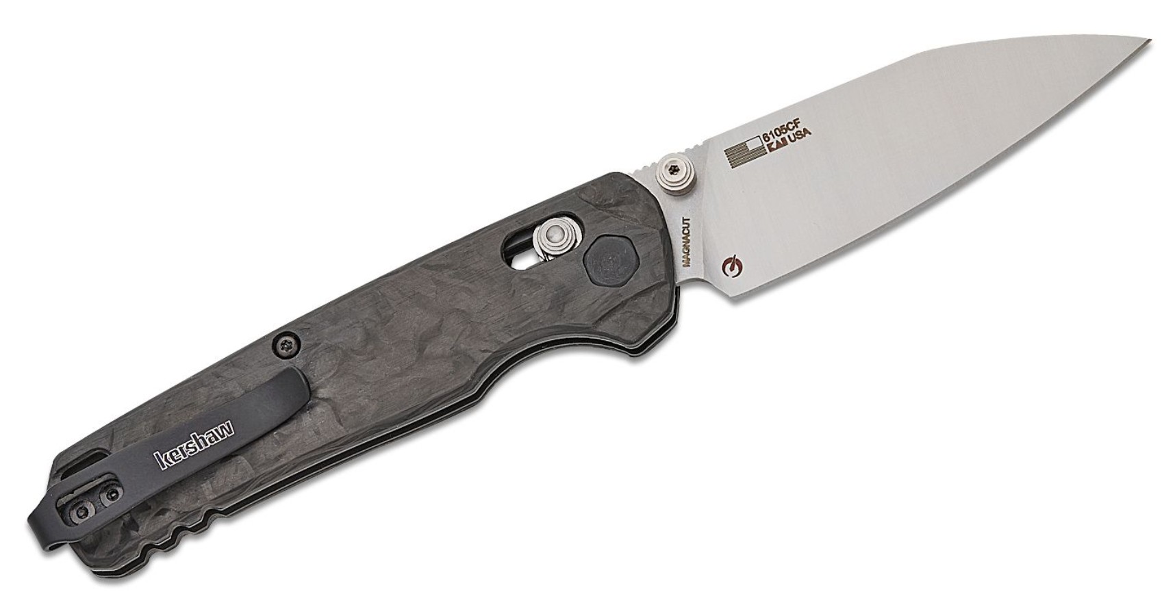 - Premium CPM MagnaCut powdered metallurgy blade steel excels in edge retention, toughness, and corrosion resistance; two-tone blade finish with stonewashed flats and satin grinds