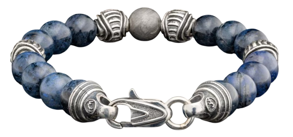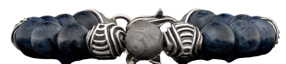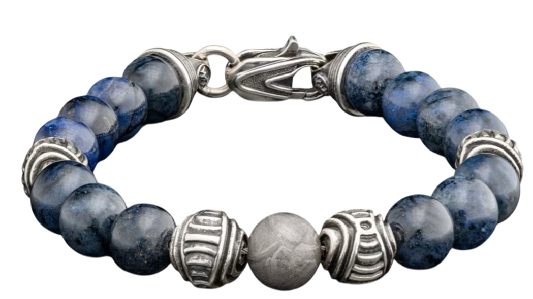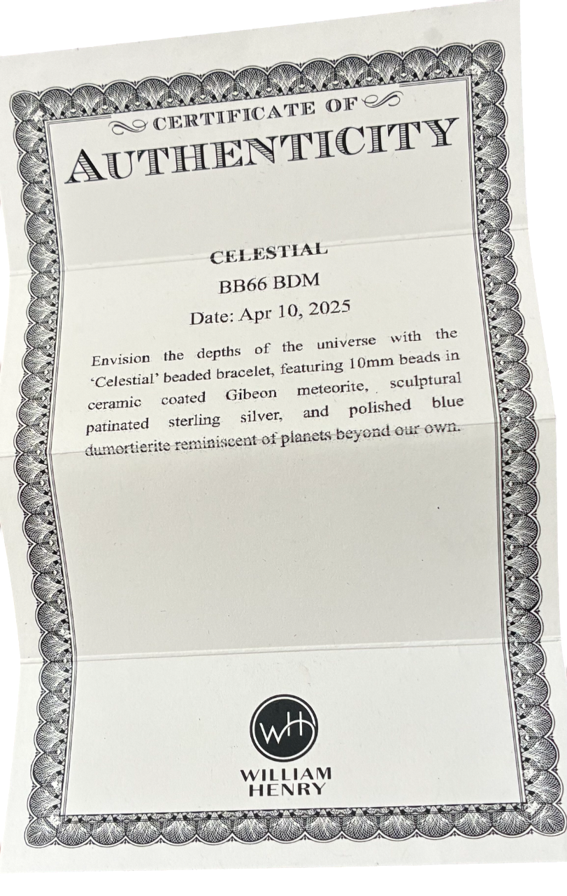 Envision the depths of the universe with the ‘Celestial’ beaded bracelet, featuring 10mm beads in ceramic coated Gibeon meteorite, sculptural patinated sterling silver, and polished blue dumortierite reminiscent of planets beyond our own.