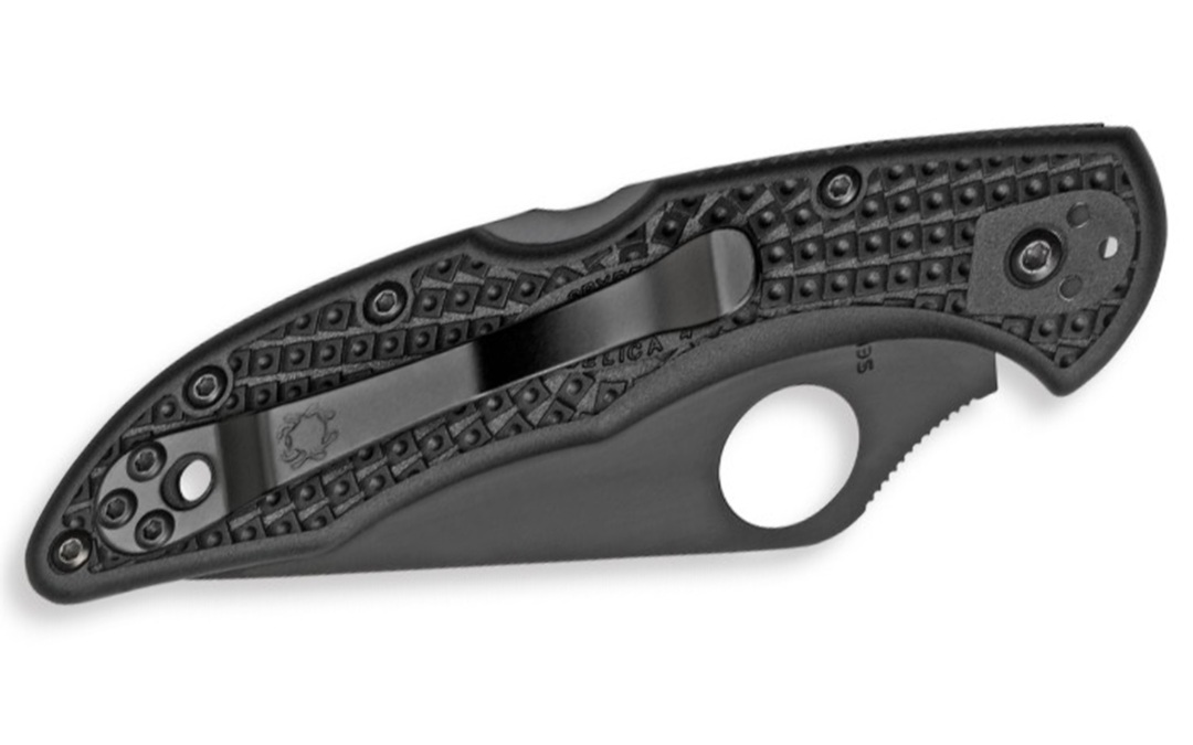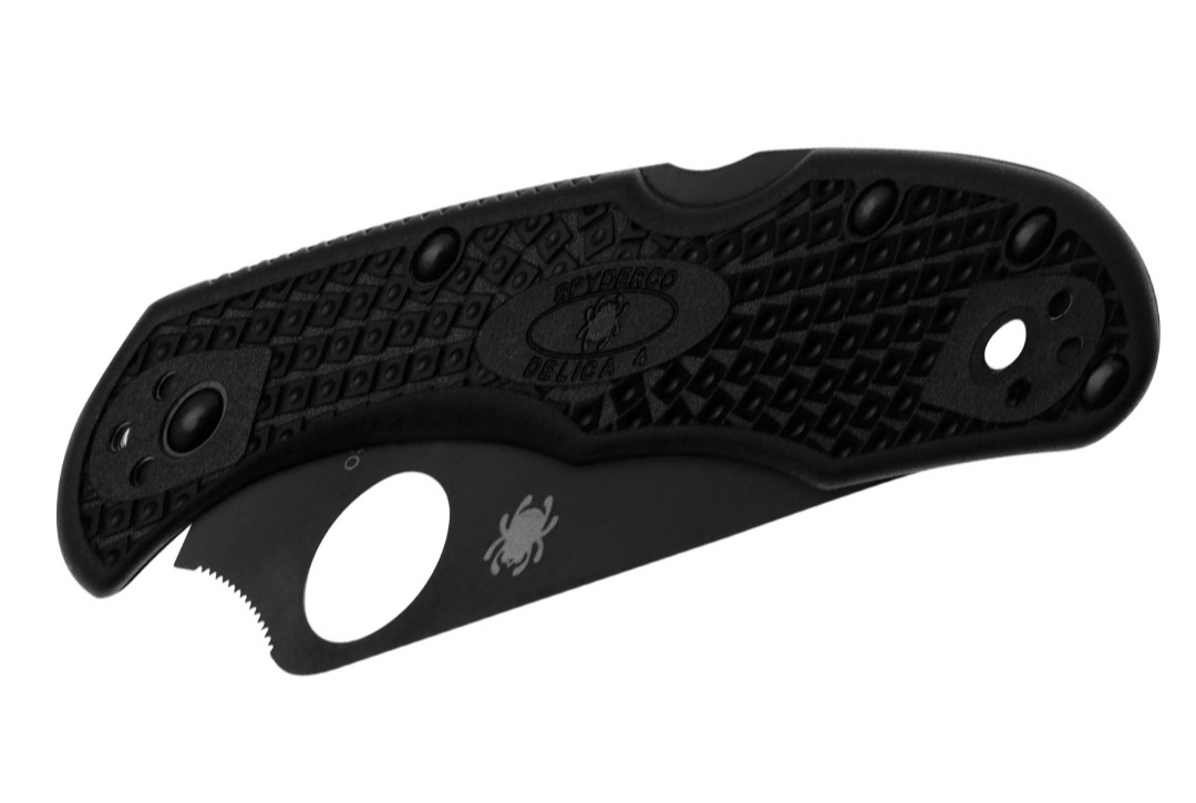 This version of the popular Spyderco Delica 4 has a non-reflective VG-10 blade that is coated with black titanium carbonitride and is flat saber-ground, has a strong tip and large 13mm opening hole. Added to the blade’s spine is slip resistant jimping.