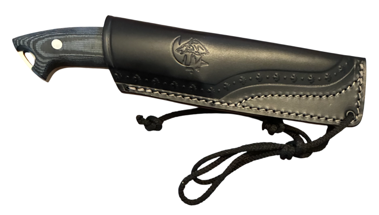 This fixed blade bushcraft knife is 9.25″ (23.5cm) overall. 4.5″ (11.43cm) satin finish Bohler N690 stainless blade. Black canvas micarta handle. Full, extended tang. Lanyard hole. Green liners. Black leather belt sheath. Made in Spain.