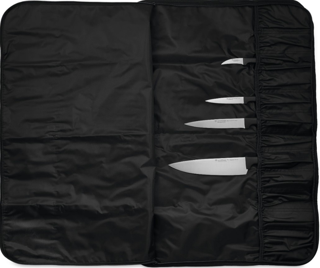 The WÜSTHOF 12-Slot Knife Case is the perfect companion for cooking in different places. The hard-wearing textile fabric is tear and abrasion resistant and offers space for up to 10 knives and accessories – up to a blade length of 32 cm. With handle and separate carrying strap for easy transport. Made in China.