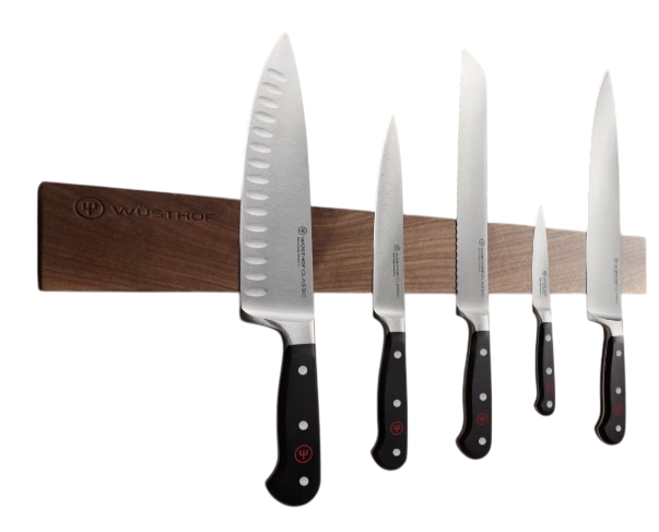 The 20” WÜSTHOF Magnetic Knife Bar made from Walnut Wood is a beautiful, easy and safe way of hanging your favourite kitchen knives. With clean lines, this modern magnetic knife bar will save space and never damage your knives as you might when placing them in kitchen drawers. This 20” knife bar is made from oiled Walnut Wood and includes a hidden super magnetic which ensures your knives will stay in place, while the beautiful grain of the wood will compliment any kitchen décor. Attach the magnetic strip to the wall with the included mounting bracket and two screws (also included). Afterwards you can easily click the wooden magnetic holder onto the mounting bracket. As a result, you won’t see the bracket or screws and the magnetic strip is tightly secured on the wall. Made in China.